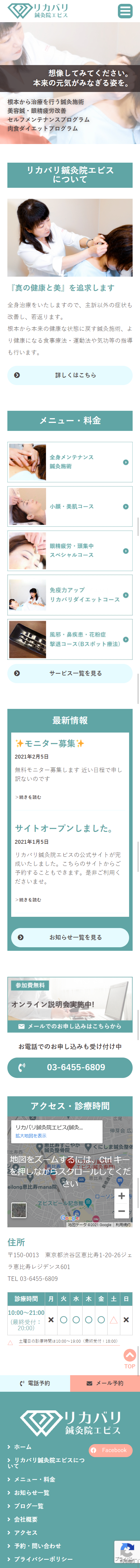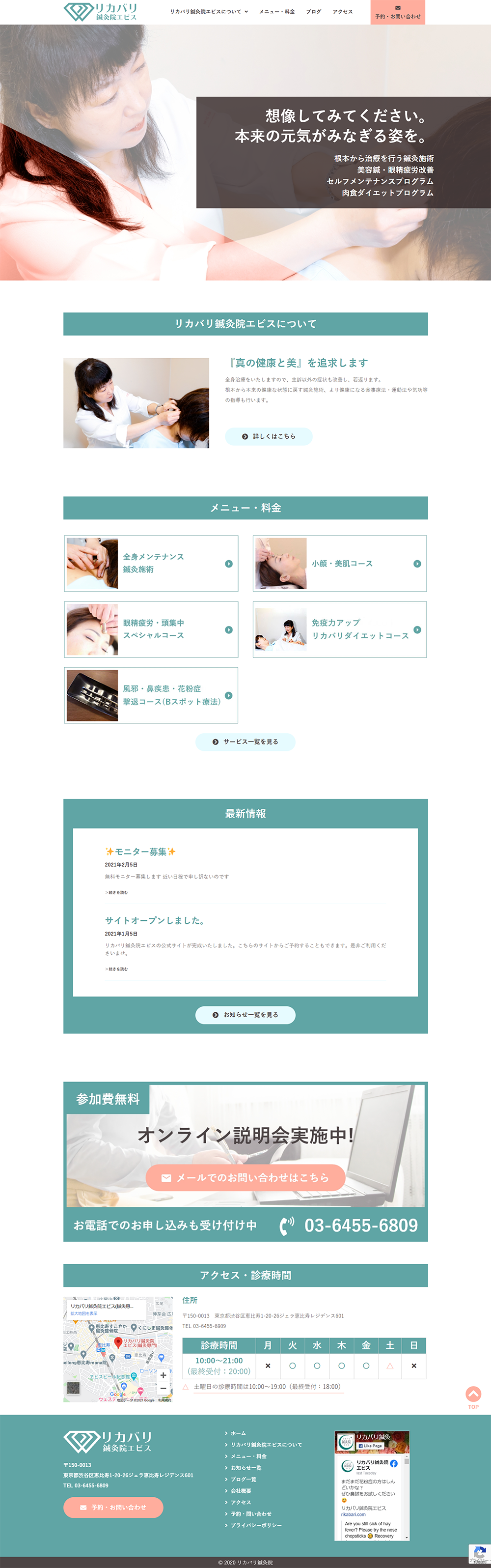 渋谷区にある男女問わない鍼灸院でしたので、装飾を控えめにし信頼感のあるデザインに仕上げました。また、スマホからの閲覧も多くあることを視野に入れ、スマホでも見やすく、予約しやすいサイトにしました。